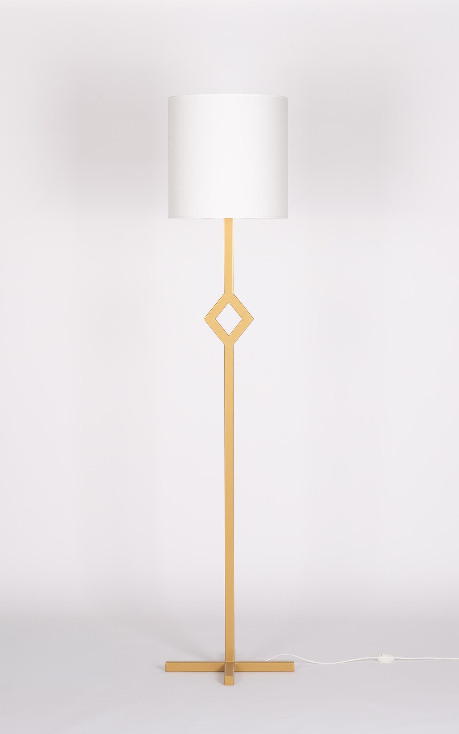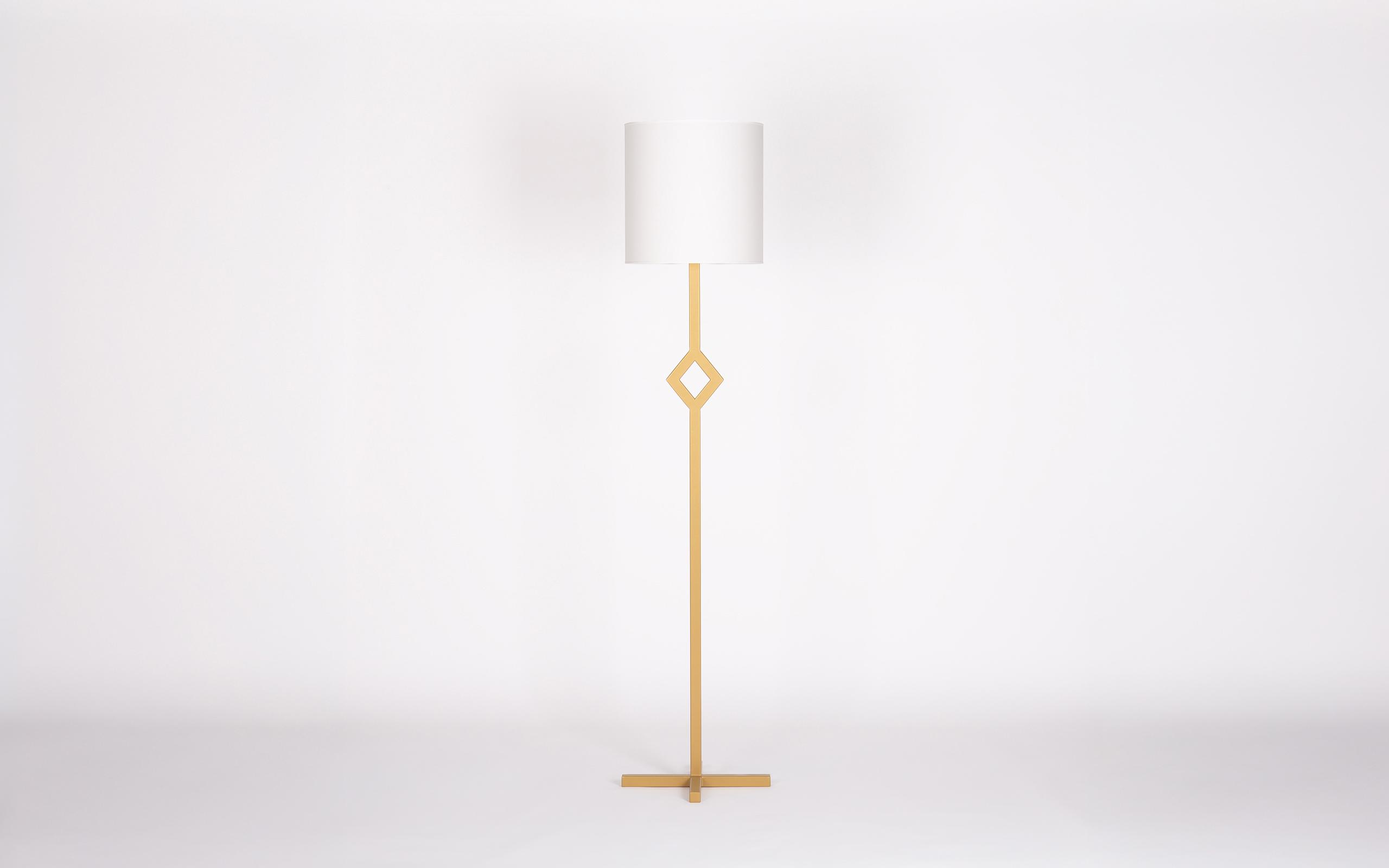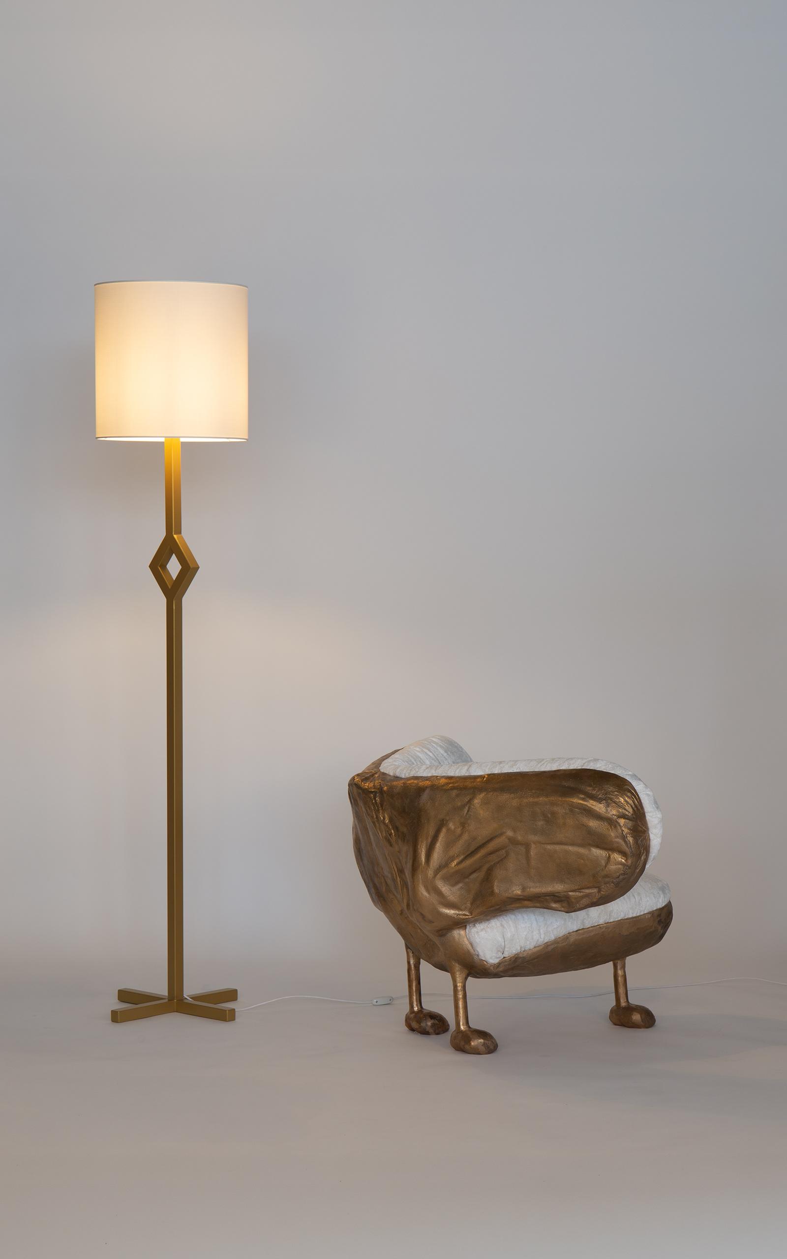 Nata all’inizio degli anni Settanta dalla poliedrica immaginazione dell’artista surrealista Roberto Matta e pensata per l’intimità della sua casa, Rombo è una lampada da terra in metallo laccato dorato lavorato a mano con paralume in tessuto, una scultura di luce che illumina la tua stanza.