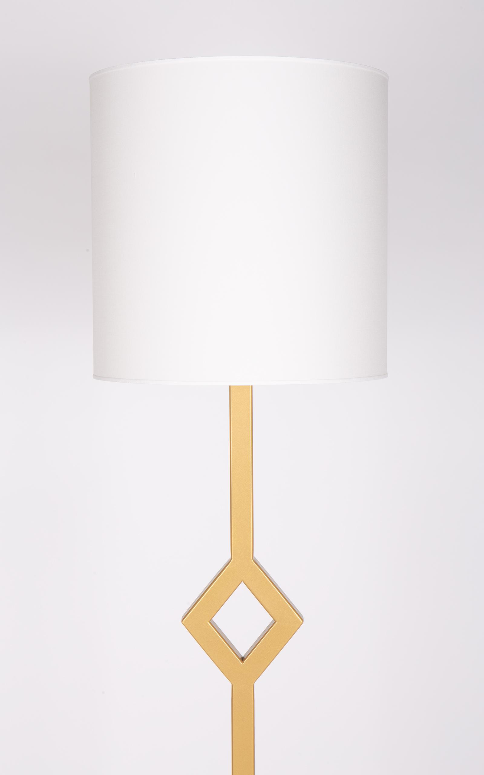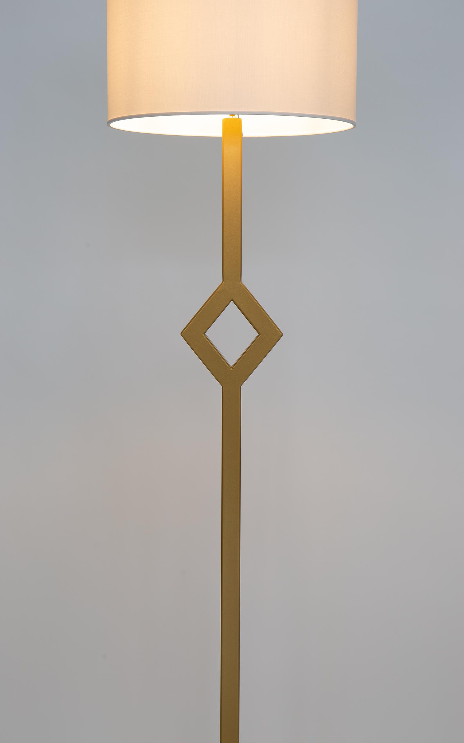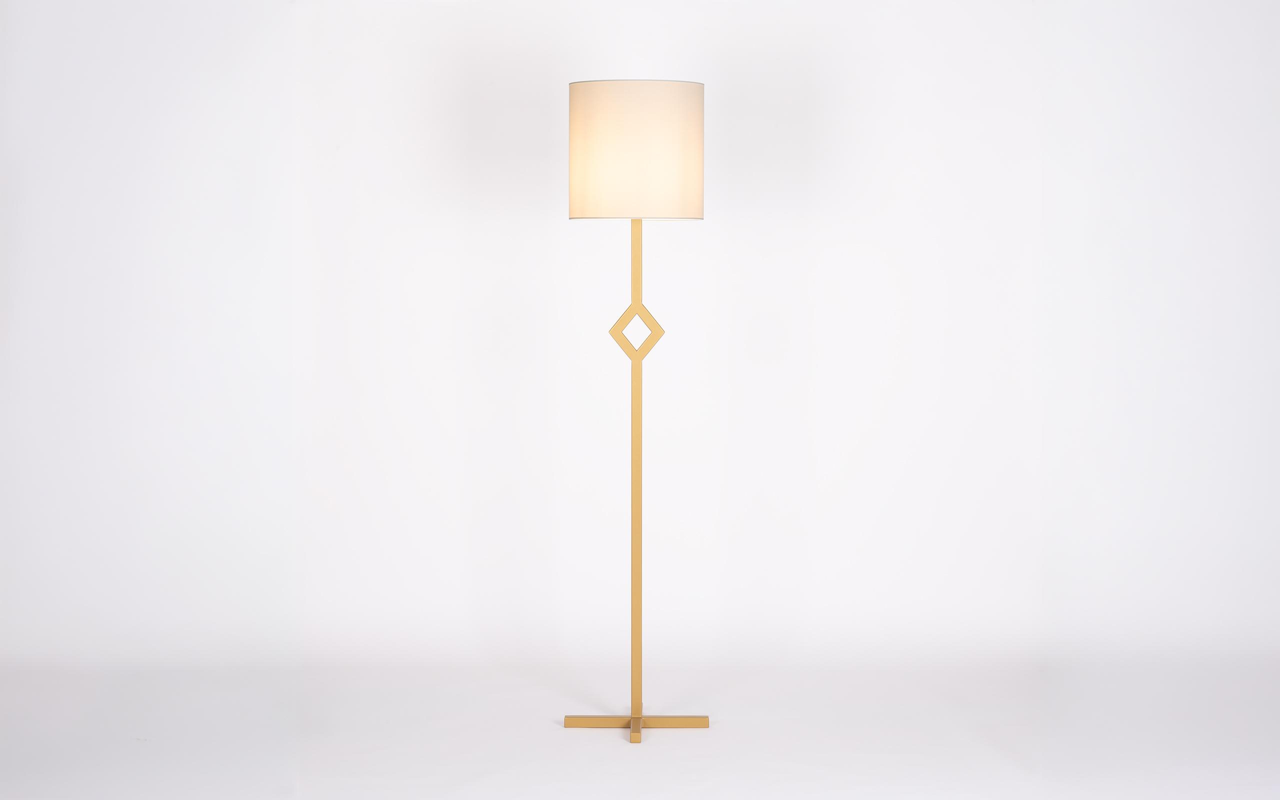 Nata all’inizio degli anni Settanta dalla poliedrica immaginazione dell’artista surrealista Roberto Matta e pensata per l’intimità della sua casa, Rombo è una lampada da terra in metallo laccato dorato lavorato a mano con paralume in tessuto, una scultura di luce che illumina la tua stanza.