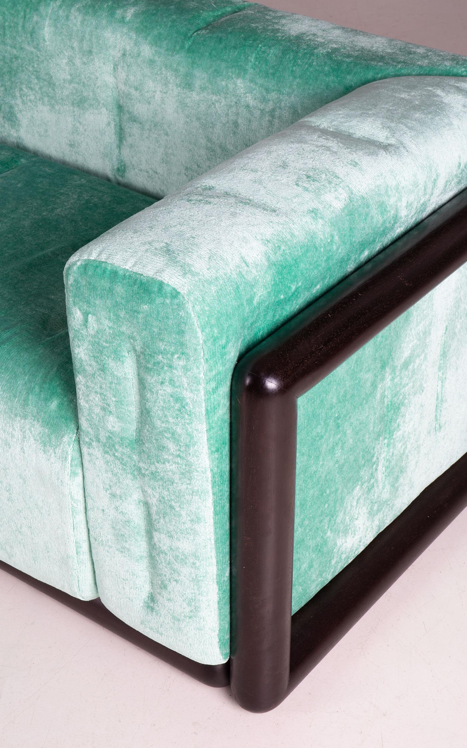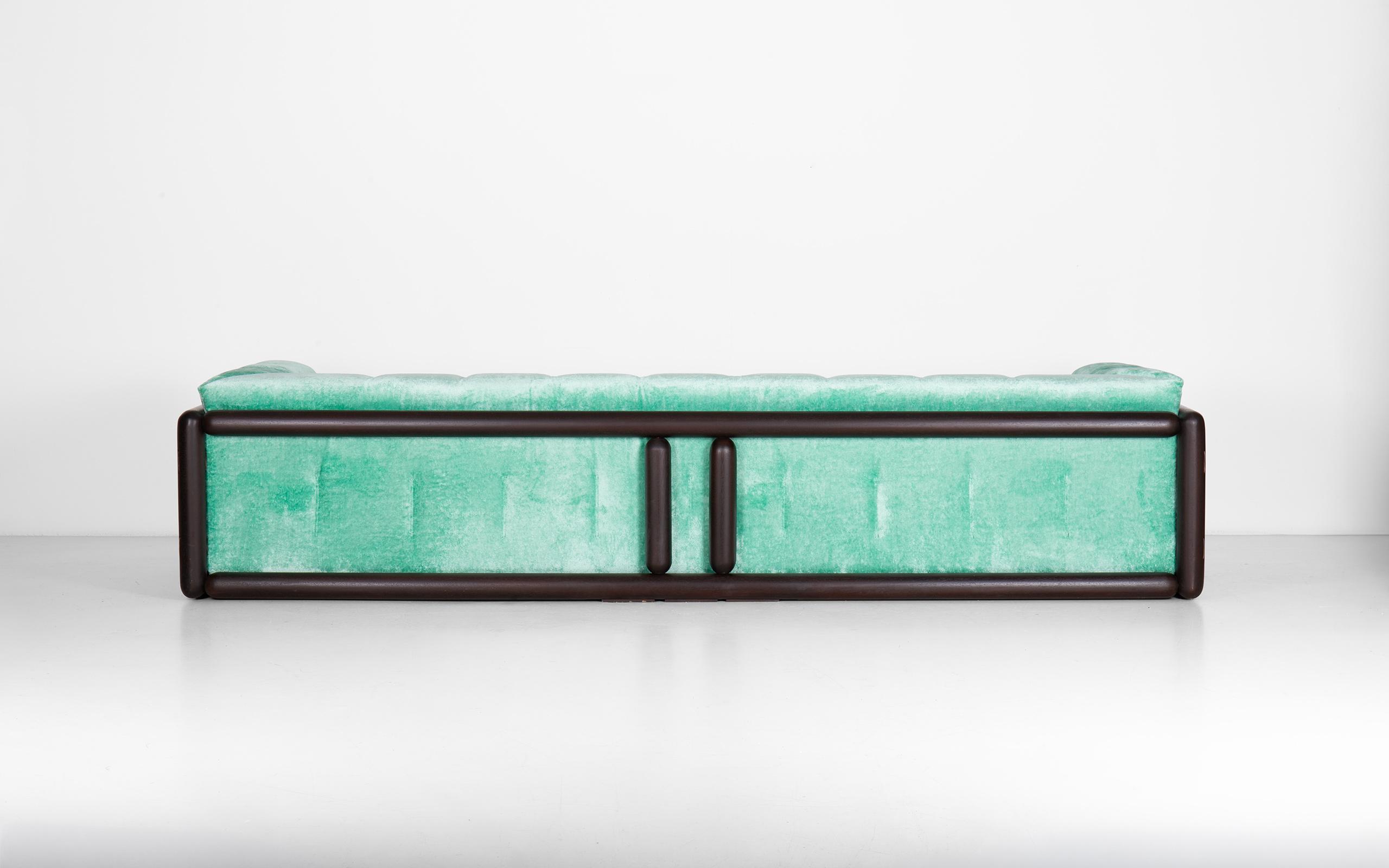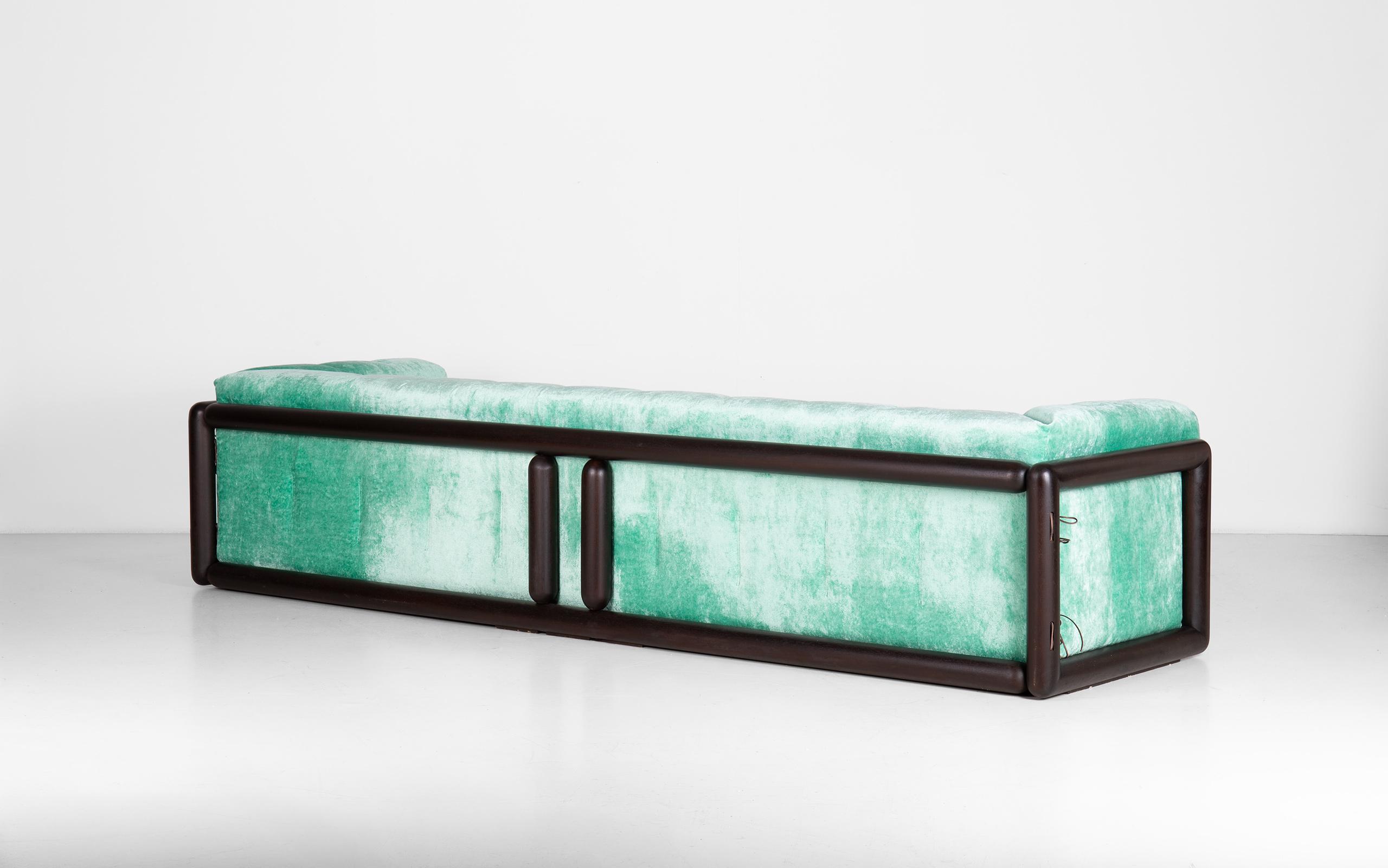 Cornaro 300 sofa designed by Carlo Scarpa. Solid hardwood structure (iroko). Polyurethane padding. Recently upholstered with original chenille velvet. The one-unit side and back cushion is fastened to the frame corners.