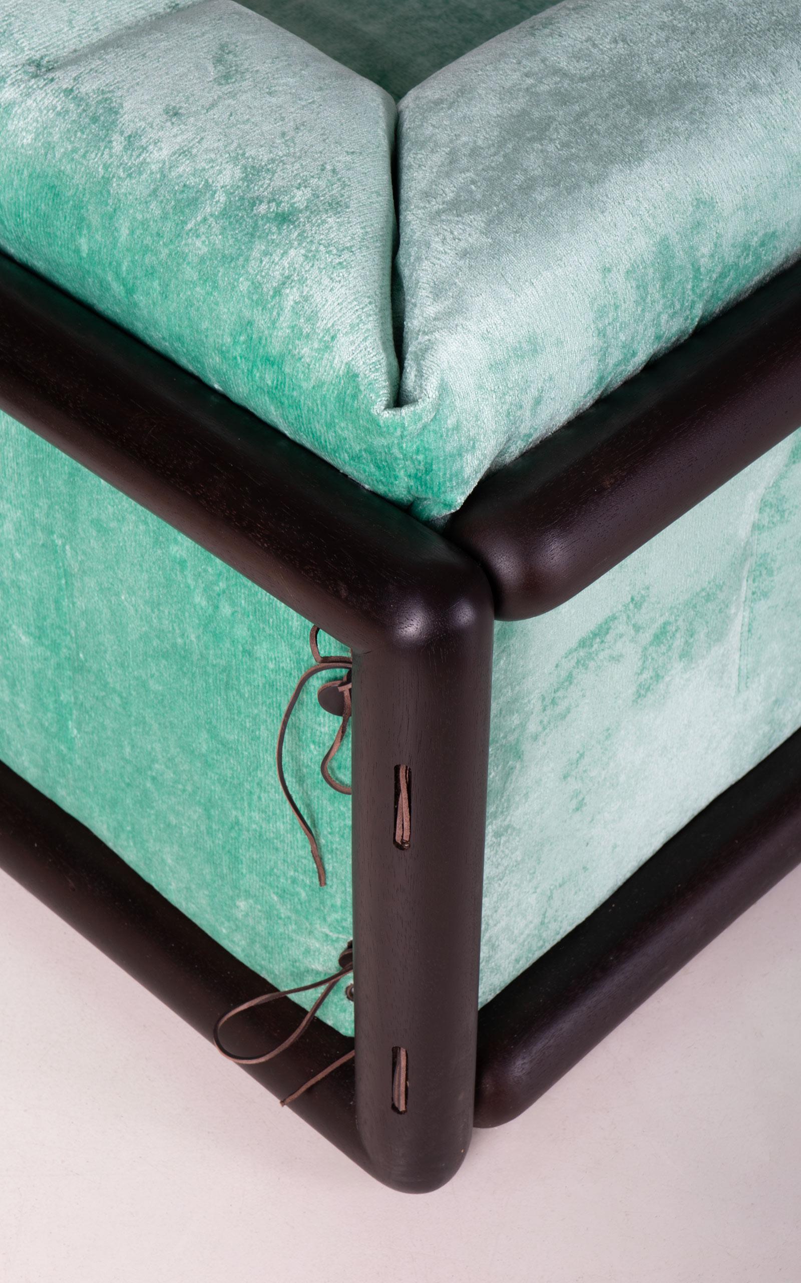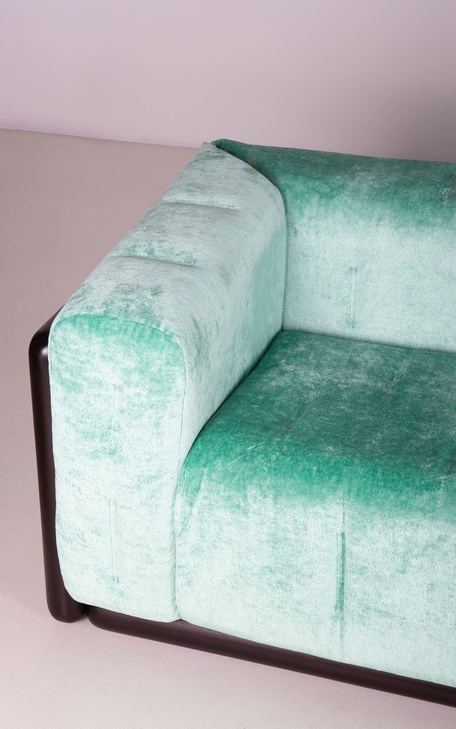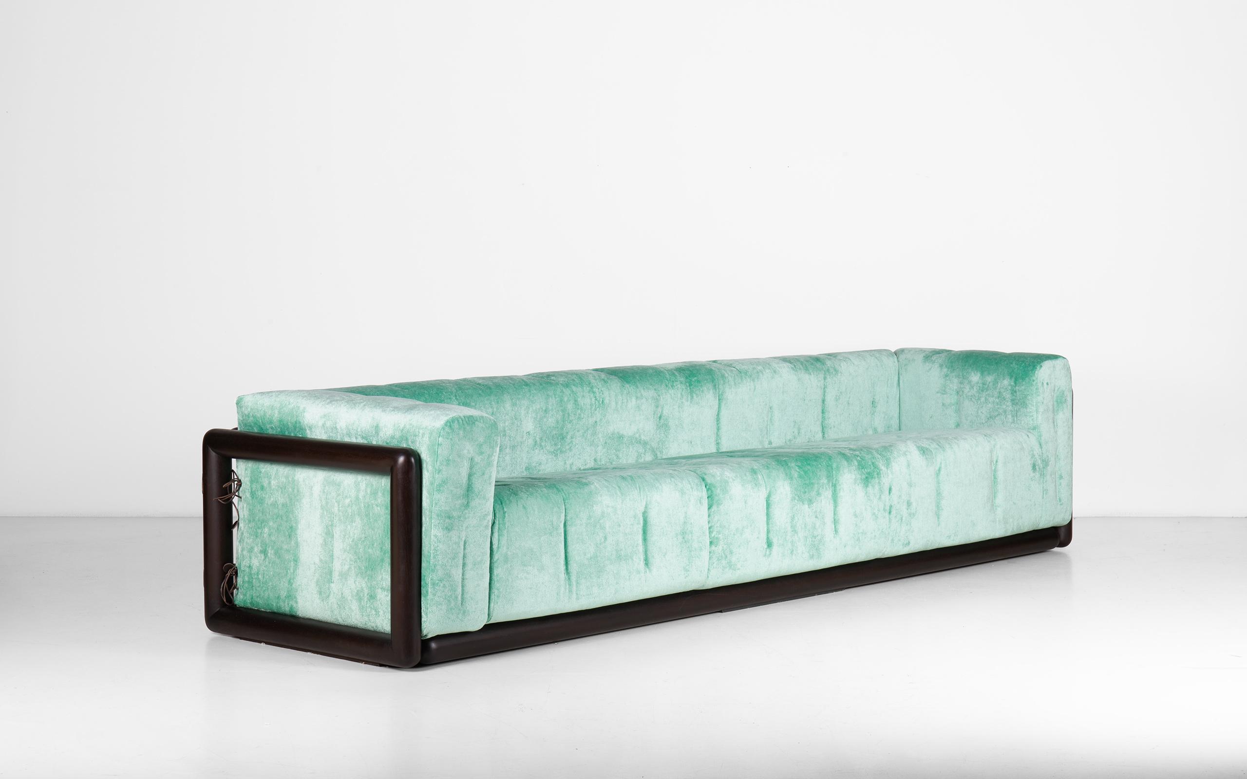Cornaro 300 sofa designed by Carlo Scarpa. Solid hardwood structure (iroko). Polyurethane padding. Recently upholstered with original chenille velvet. The one-unit side and back cushion is fastened to the frame corners.