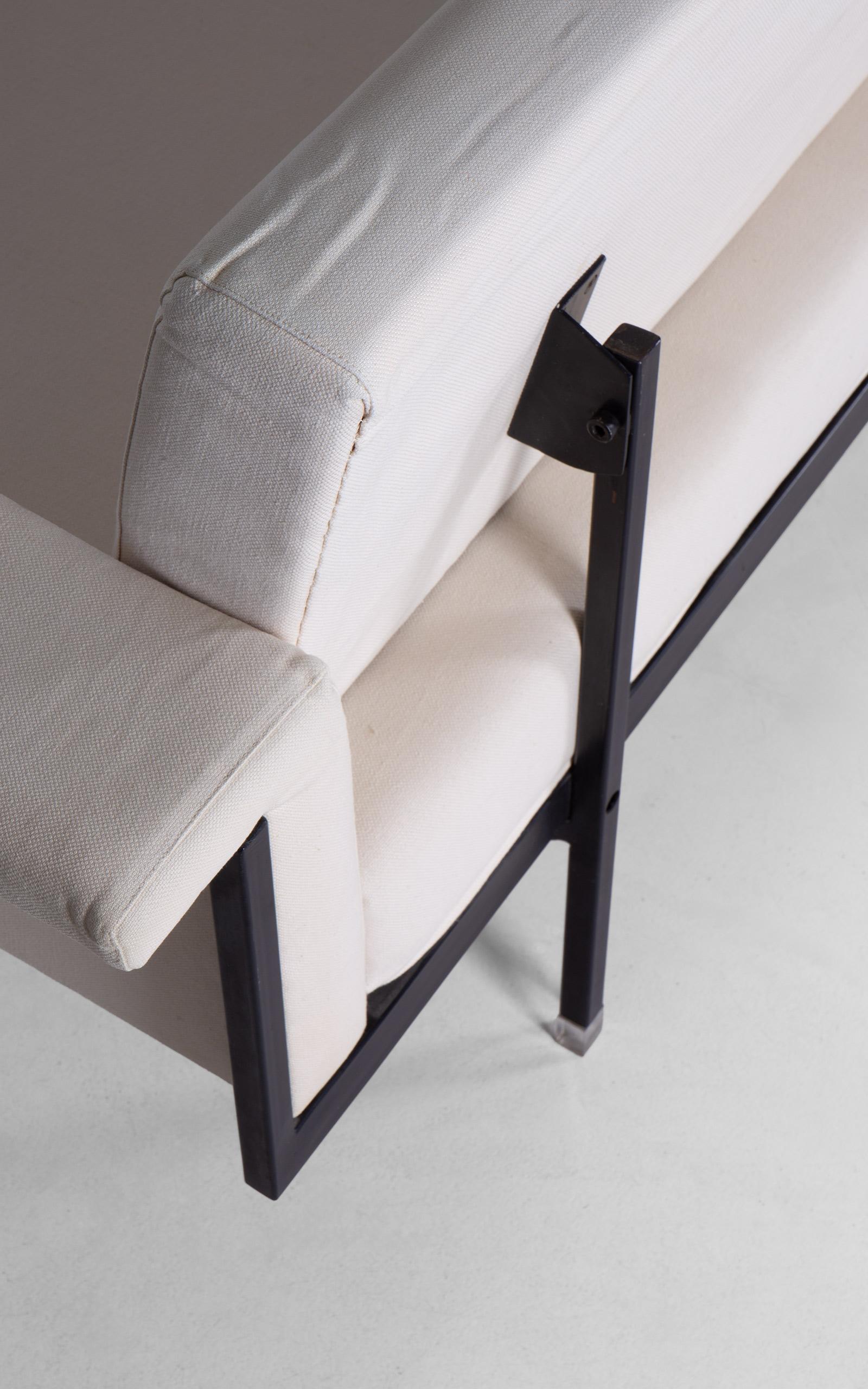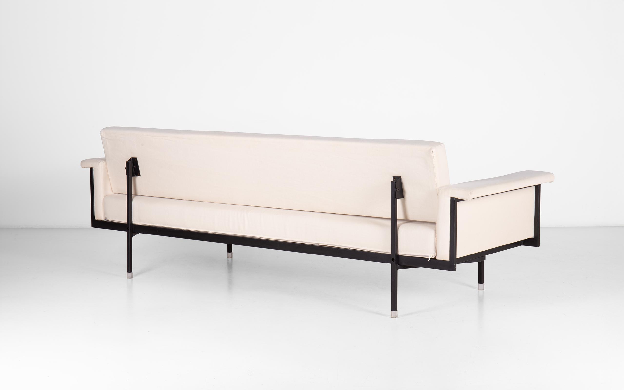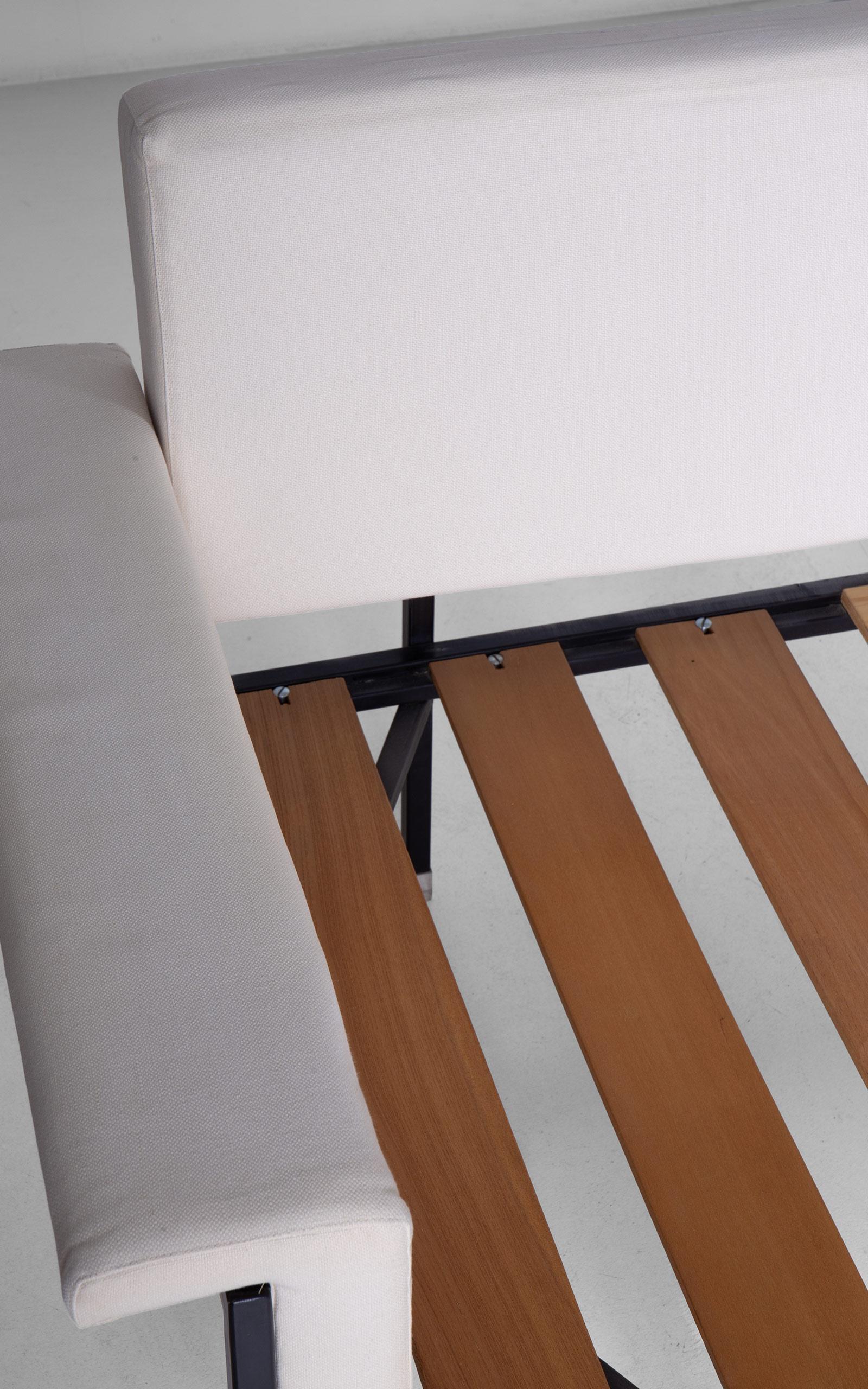 Naeko sofa (daily bed) by Kazuhide Takahama, first model manufactured by Gavina. Supporting structure in metal, polyurethane foam padding, original upholstery, slightly elastic wooden slats, transparent fiberglass feet ends. Fully reclining backrest to transform the sofa into a daily bed.