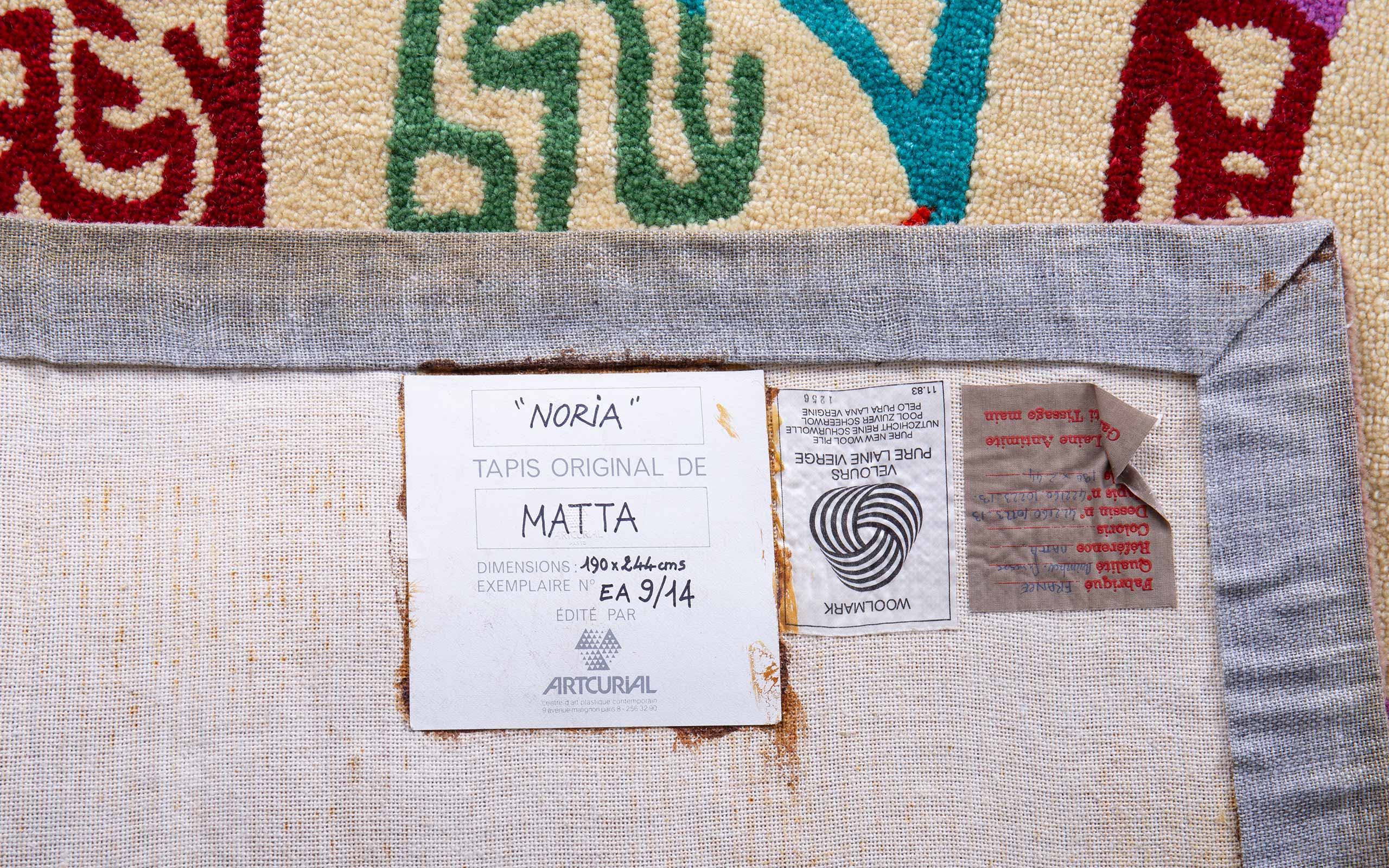 Noria carpet designed by Roberto Matta and realized in a limited edition for Artcurial in 1984. Two pieces available (AP 9/14 and 10/14). Pure new wool pile.